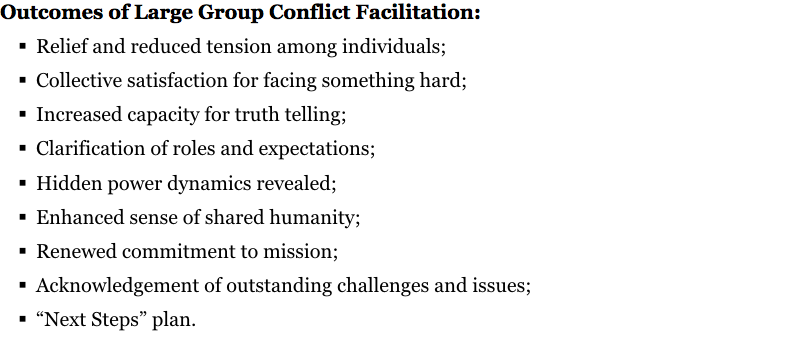 To best support a group’s ongoing development, a large group conflict facilitation is concluded with my drafting a summary report of recommendations emerging from the group’s process.